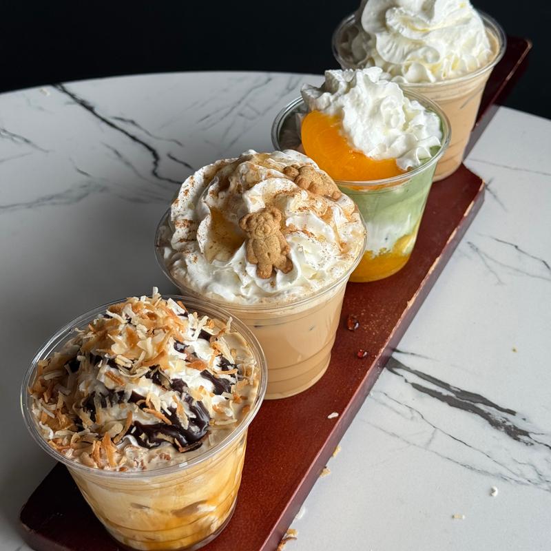 4 nine ounce samples of our Samoa Shaken Espresso, Teddy Graham Latte, Agave Vanilla Bean, and Peaches & Cream Matcha. Iced only