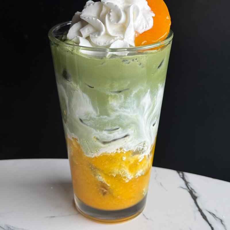 A layer of peach puree topped with cream, then vanilla cupcake matcha, whipped cream, and a peach slice. Iced only