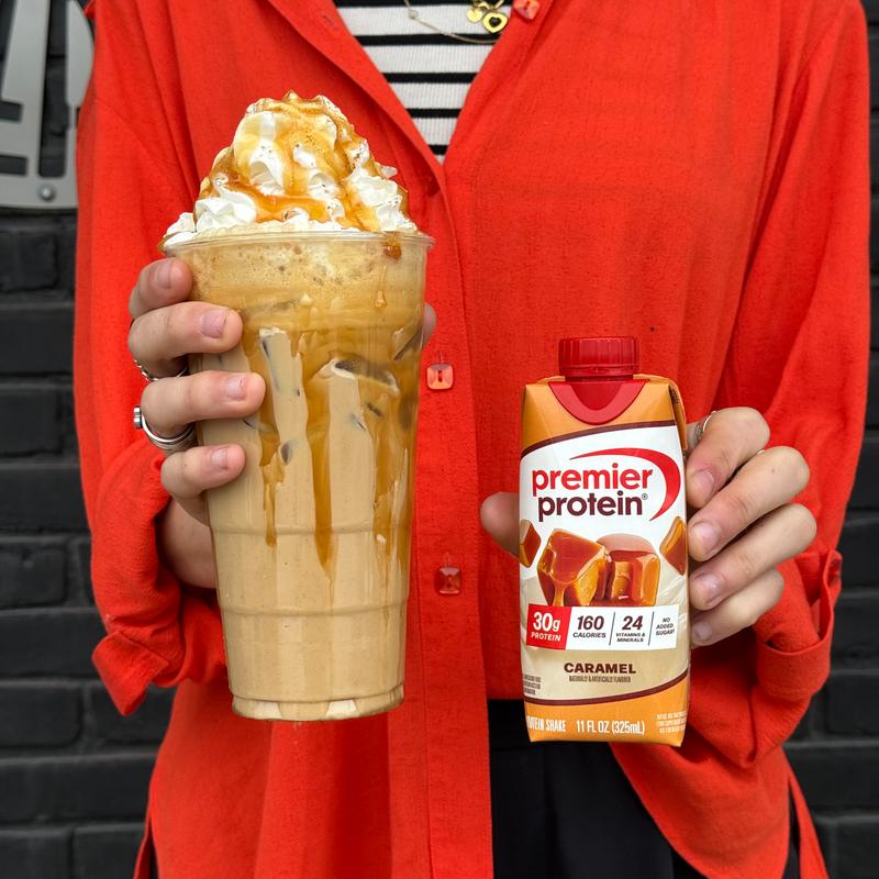 Espresso, cinnamon, a touch of white chocolate, Caramel Premier Protein, whipped cream. 30 grams of protein! Hot or iced